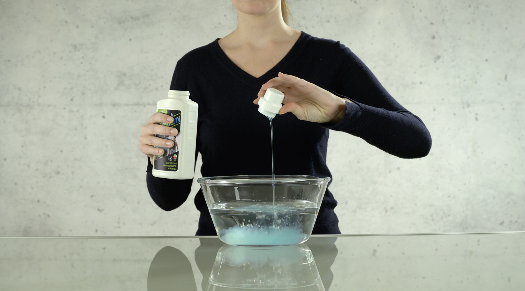 Die Flasche besteht aus 100 % recyceltem Material. Einfache Anwendung durch praktischen Dosierverschluss.